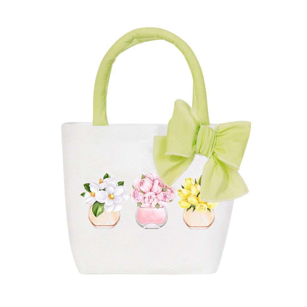 Exkluzívna dievčenská letná kabelka so zelenými rúčkami, potlačou farebných kvetín a zladenou mašľou