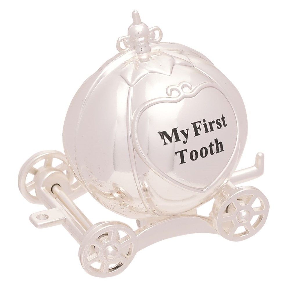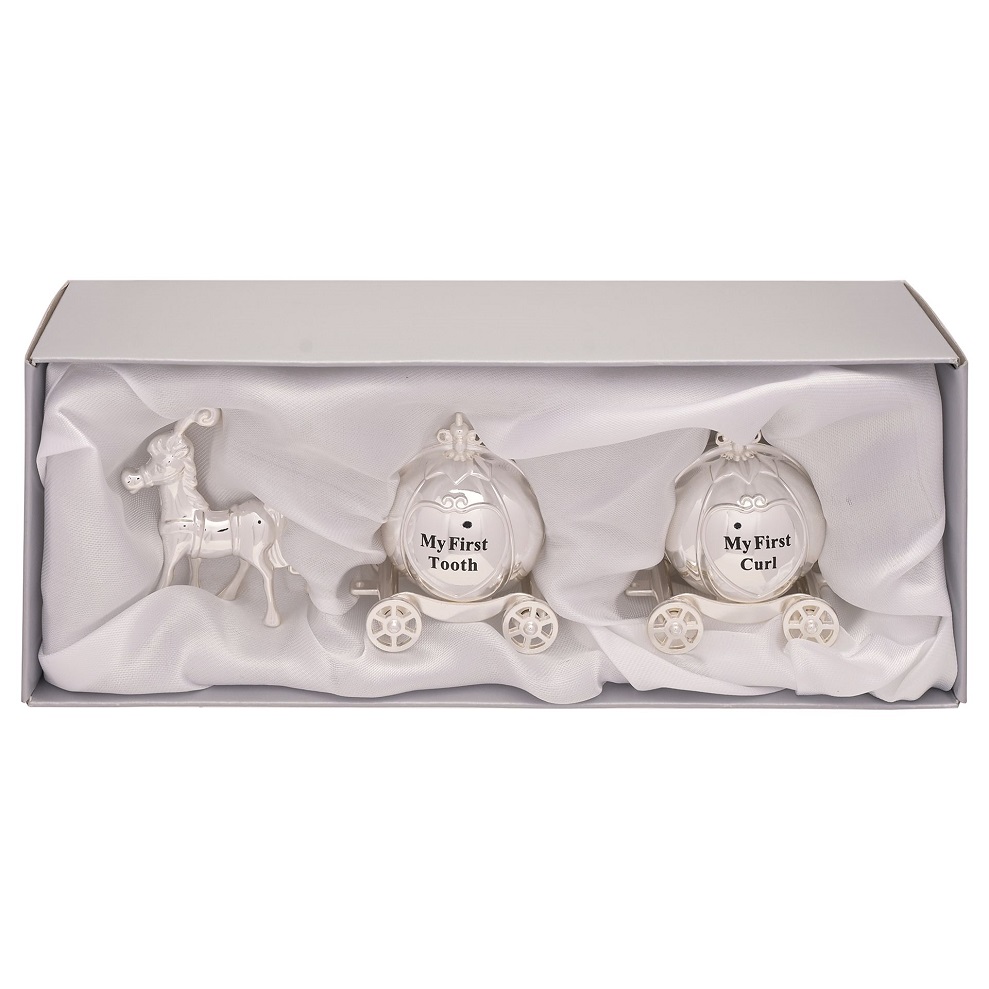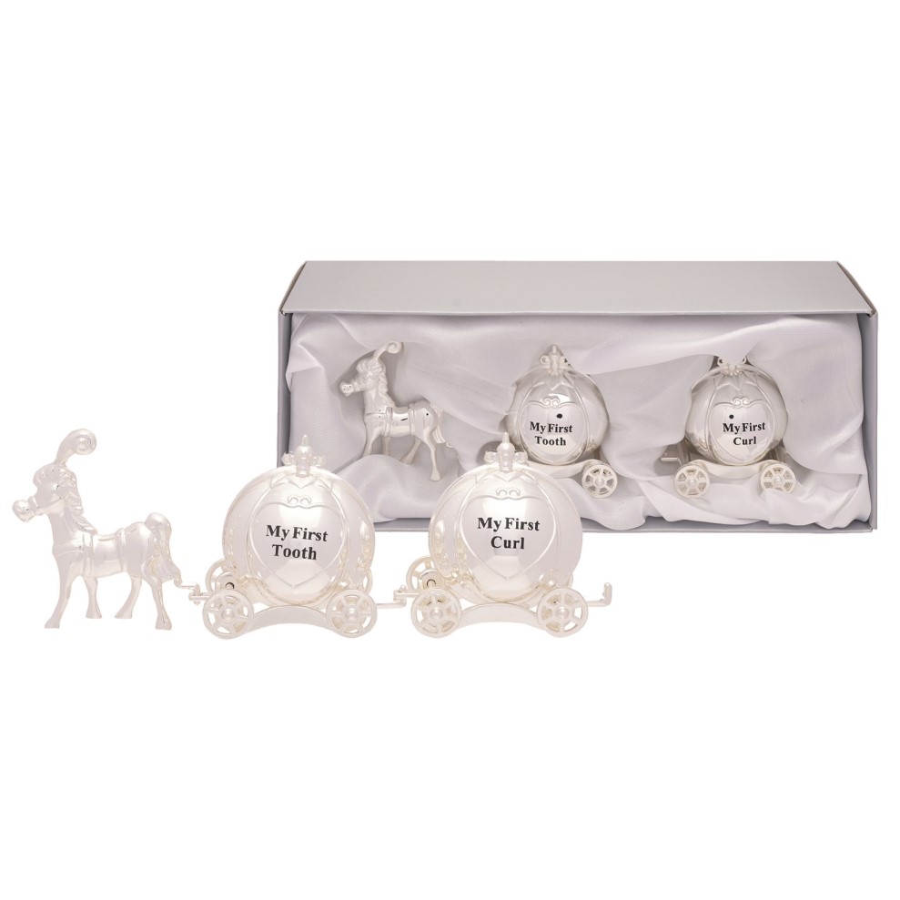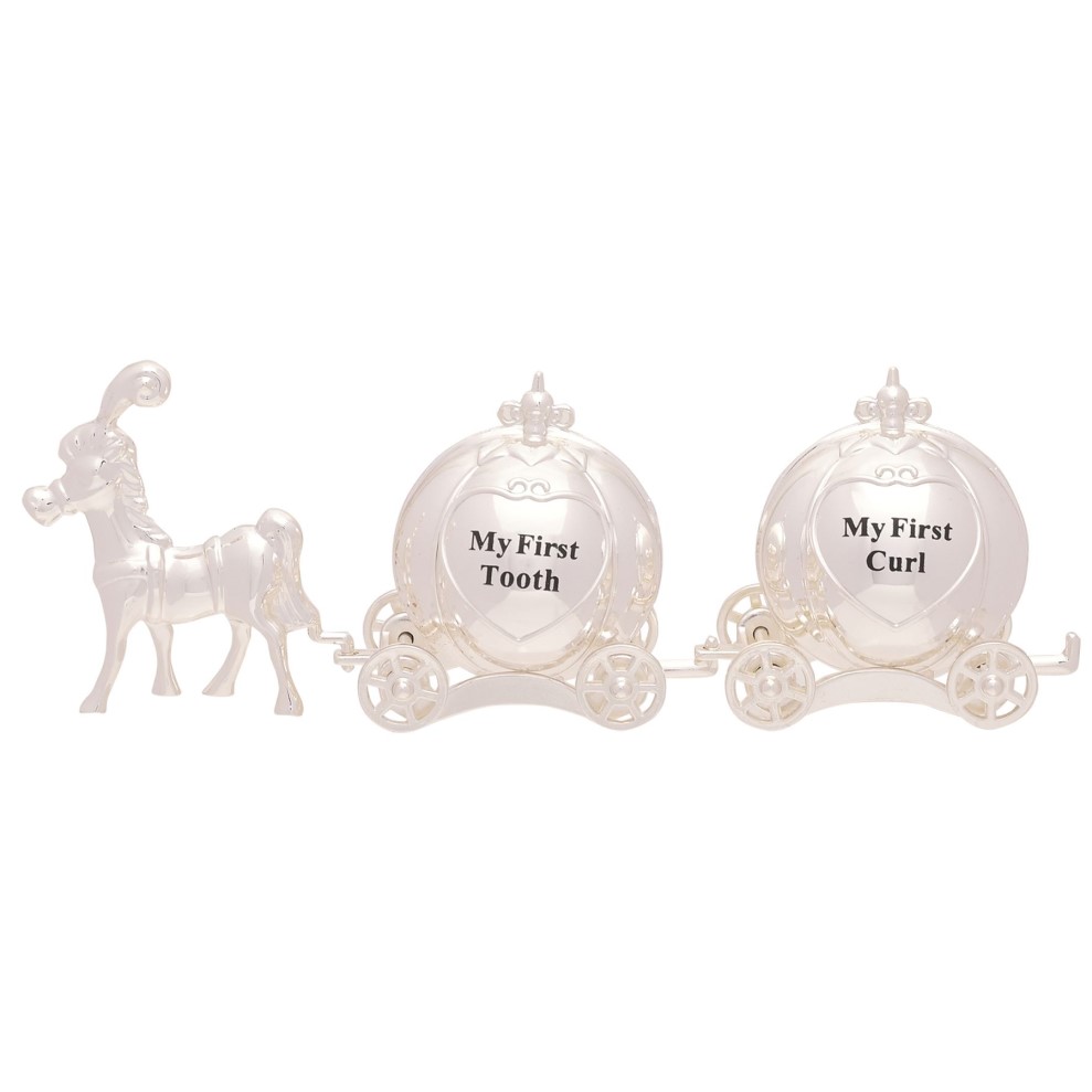 Úžasná postriebrená súprava koňa a koča „Môj prvý zub“ a „Moja prvá kučera“