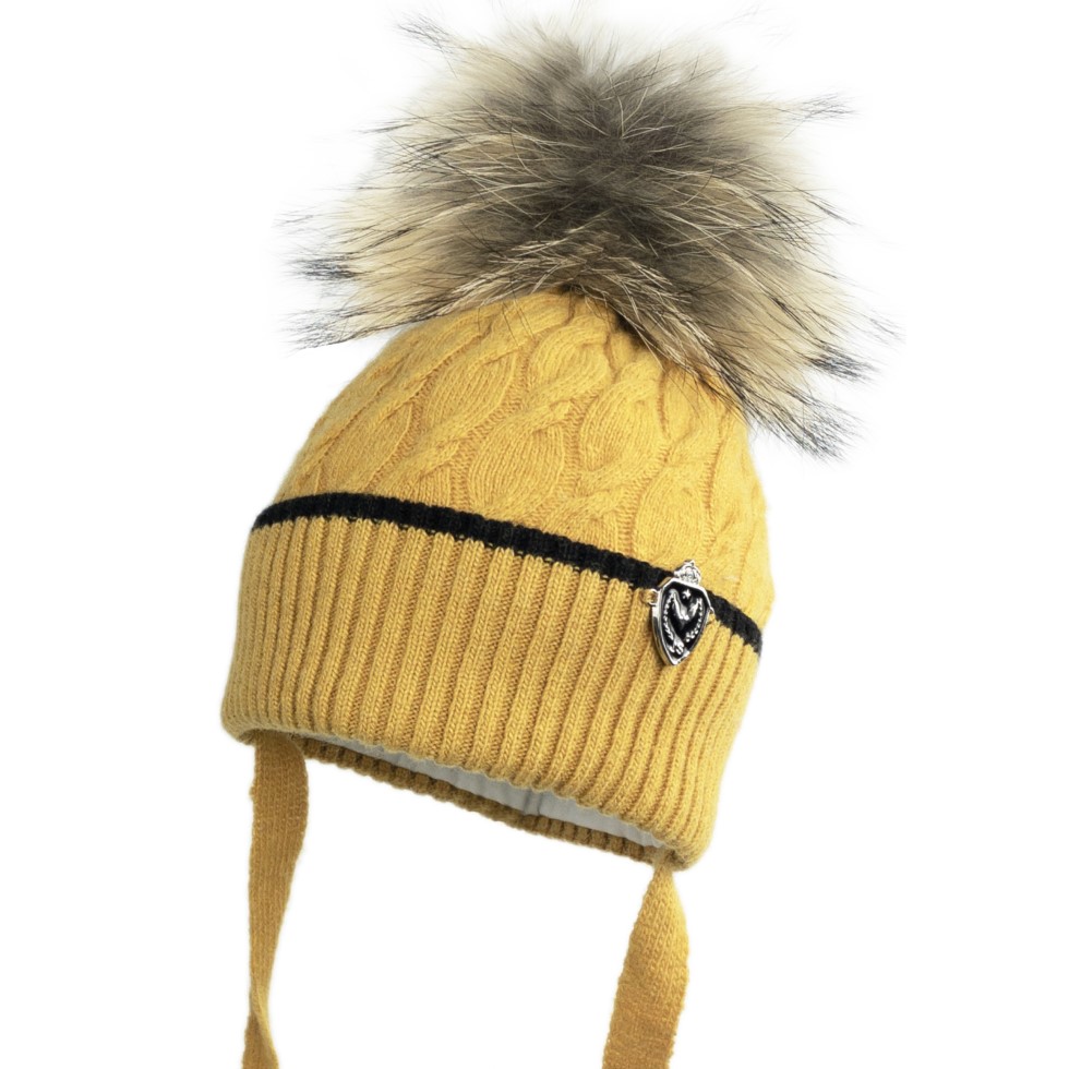 Štýlová chlapčenská zimná čiapka – podšitá v medovo- žltej farbe, zdobená bohatým brmbolcom z naturálnej kožušiny