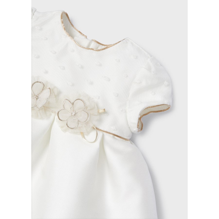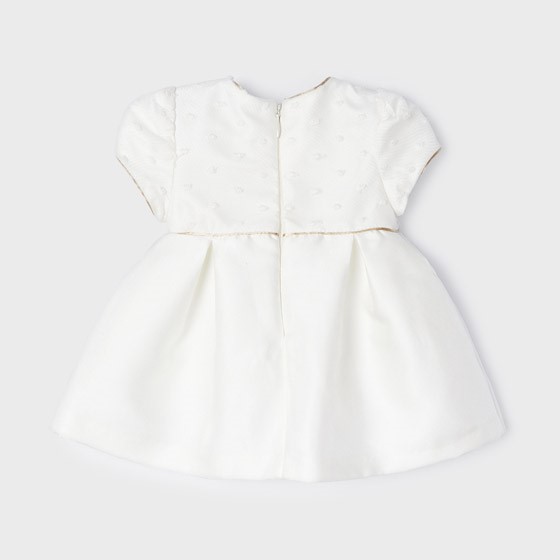 Dievčenské elegantné šaty, olemované zlatou niťou a zdobenou mašľou v páse, vhodné do krstu a na slávnostné príležitosti